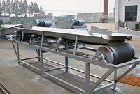 該輸送機(jī)主要由輸送帶、驅(qū)動(dòng)裝置、傳動(dòng)滾筒、托輥及機(jī)架等部件組成。